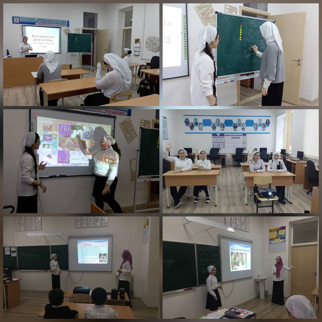 02.12.2019Классные часы, приуроченные ко Дню матери:.-“Все начинается с матери"-"Героические женщины Чечни".Цель проведения классных часов: -воспитывать у учащихся уважение и любовь к самому родному человеку-матери,чувство доброты и заботы о близких людях.