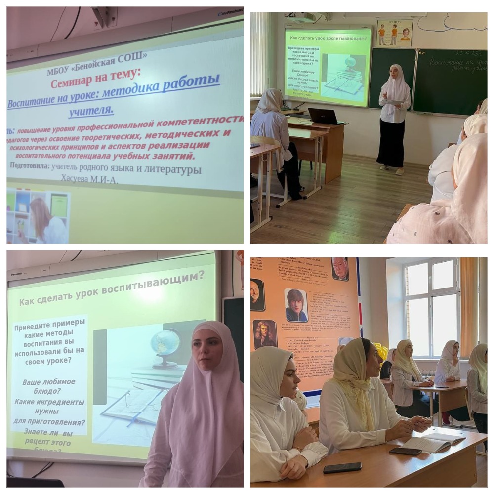 Педагогический коллектив МБОУ "Бенойская СОШ" неустанно развивает профессиональное мастерство и прилагает все усилия для улучшения качества образования. Вот и сегодня учитель чеченского языка Хасуева Мадина Им-Алиевна провела методический семинар на тему "Что делает урок воспитывающим". Семинары проводятся согласно утвержденному графику и носят систематический характер.