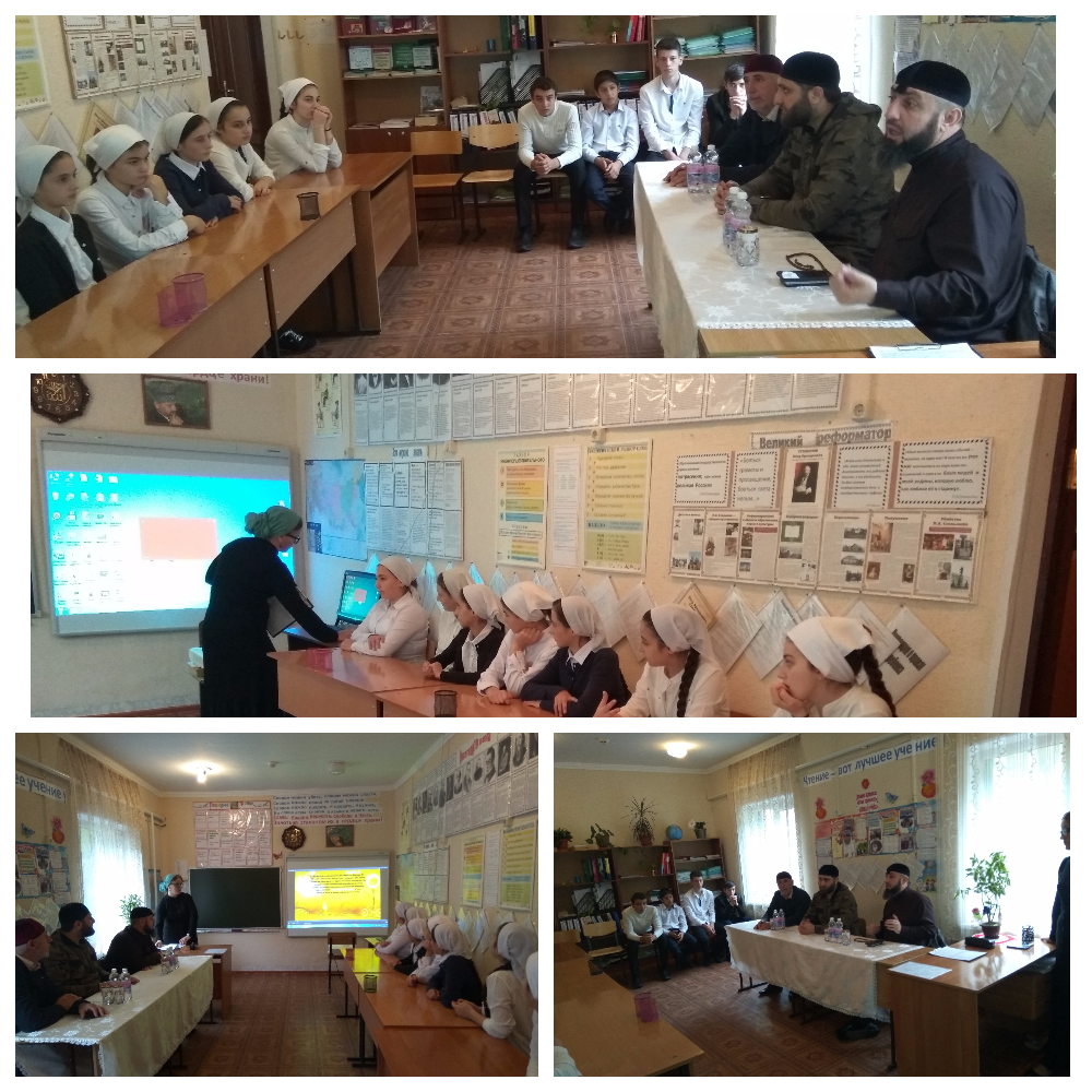 14.10.2017В МБОУ «Бенойская СОШ» заместителем директора по ВР Тайсумовой М.Х была проведена для обучающихся старших классов «Семья и семейные ценности». Беседа была организована с целью формирования у подрастающего поколения представления о жизненном идеале семьи. В беседе также приняли участие приглашенные гости: представители духовенства Веденского района.