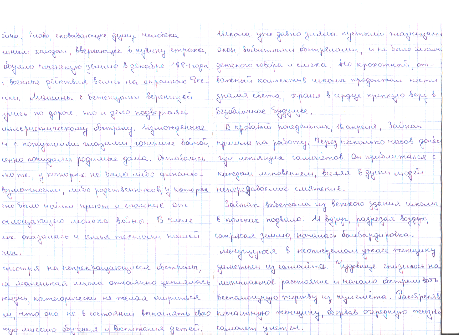 Исследователи взяли интервью у родителей пострадавших детей в годы военных действий. Были записаны рассказы со слов очевидцев. Ребята очень серьезно отнеслись к своей работе. Они подготовили мультимедийную презентацию с фотографиями нашей республики до и после военных действий, а также подготовили кинолекторий с событиями военных лет. Итогом их исследования стали открытые уроки, проведенные во всех классах с участием родителей пострадавших детей.