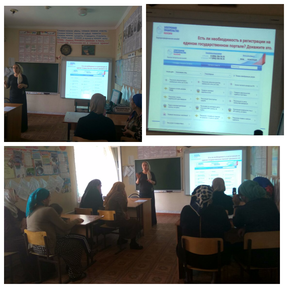 «Негоже в век автомобиля ездить на телеге», - с таких слов начала мероприятие директор школы Демельханова З.У. Она рассказала родителям о всех преимуществах использования госуслуг. На презентации была подробно продемонстрирована процедура регистрации. Вниманию присутствующих, также был представлен широкий спектр услуг электронного правительства.