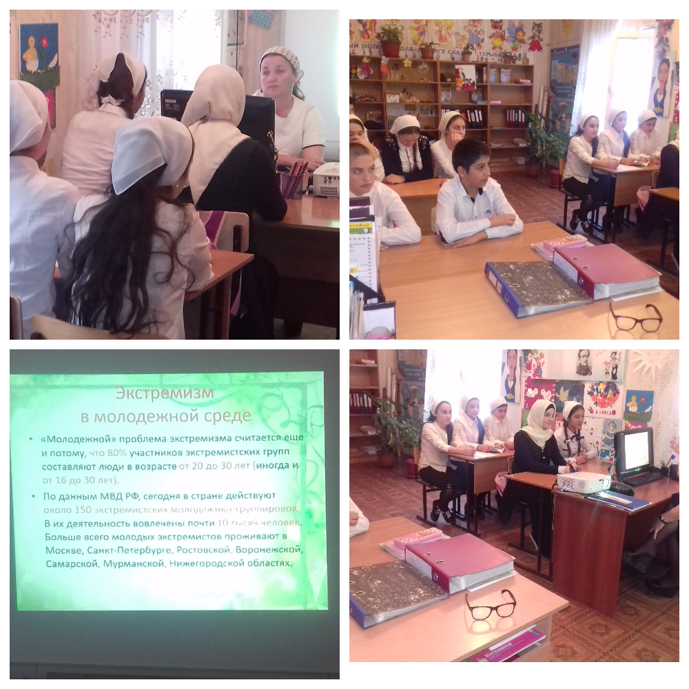 В рамках реализации программы школы по духовно-нравственному воспитанию подрастающего поколения зам. дир. по ВР Тайсумова Мадина Хароновна провела сегодня профилактическую беседу с обучающимися старших классов на тему экстремизма. Мадина Хароновна объяснила детям, что экстремизм-это направление, несущее смертельную опасность как для самого человека, так и для всего общества в целом.
