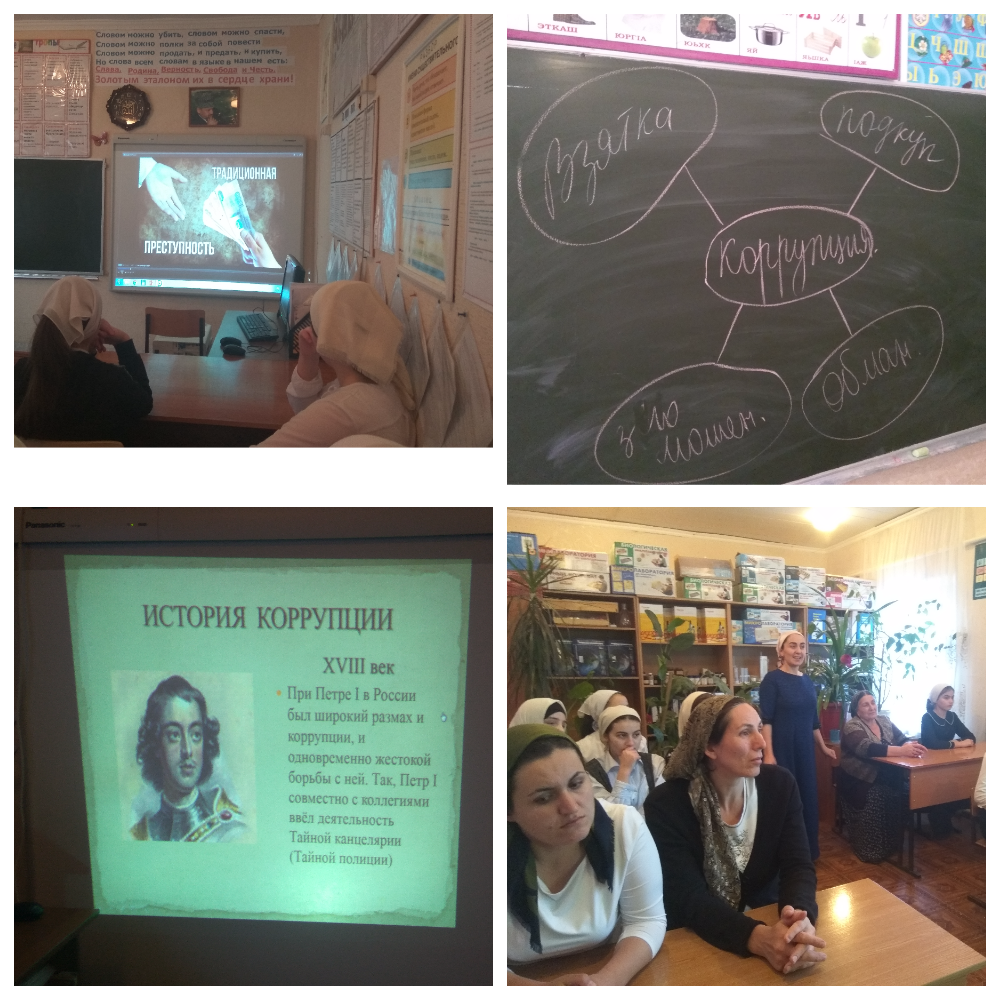 05.12.2017Огромную роль в деле борьбы с коррупцией, несомненно, играет правовое просвещение. Заместитель директора по ВР начала антикоррупционную неделю с беседы «Роль гражданского общества в борьбе с коррупцией». Мадина Хароновна использовала элементы дискуссии, деловой игры, создание ситуаций и нахождение путей правомерного выхода. Беседа способствовала формированию нравственной и правовой культуры учащихся, овладению навыками поведения в рамках правового поля.Классные часы были проведены и в 4-8 классах, на которых был подготовлен материал в игровых формах. Руководителем общеобразовательной организации Демельхановой З.У. был проведен лекторий «Скажем коррупции-нет!» . В вводной части лектория было отмечено, что коррупция была и остается одной из глобальных проблем, стоящих перед мировым сообществом.