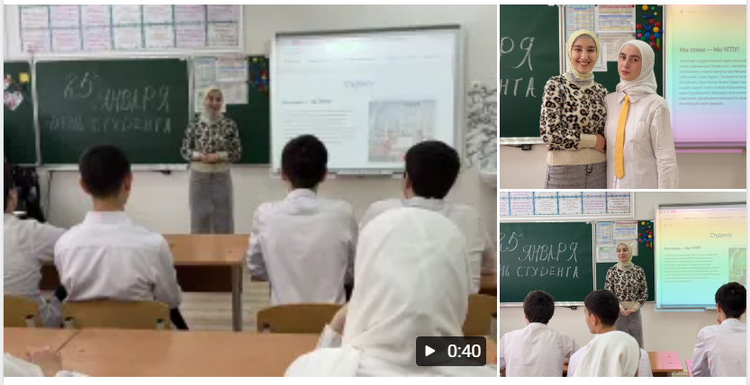 В МБОУ «БЕНОЙСКАЯ СОШ» советник директора по воспитанию и взаимодействию с детскими общественными объединениями Байсултанова С.А организовала встречу со студенткой ЧГПУ Элихановой Маккой Рамзановной.