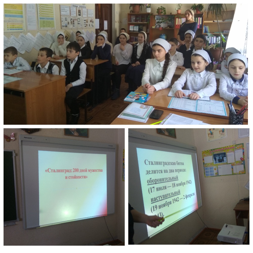 01.02.2018Заместитель директора по ВР Тайсумова М.Х провела для обучающихся школы патриотический час «Сталинградская битва и ее значение». С помощью кинолектория и мультимедийной презентации материал был преподнесен детям в доступной форме.