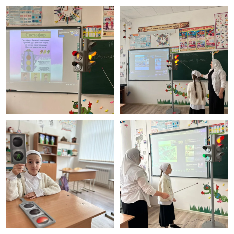 Так, учитель начальных классов Хасуева З.С. провела с малышами «минутку безопасности» дорожного движения 🚸🧩.