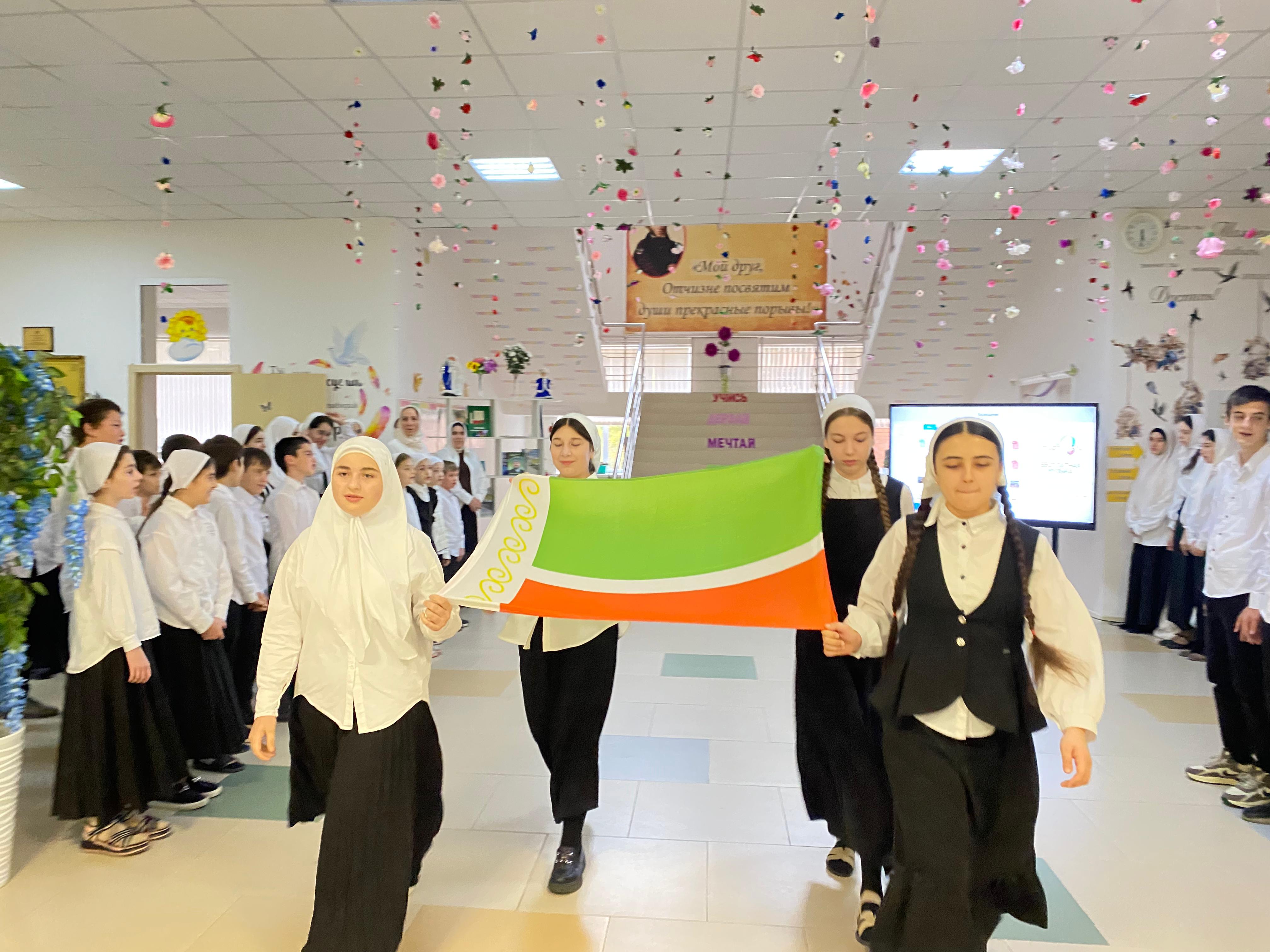 Под звуки гимна России наши лучшие ученики торжественно внесли флаги: 🏁 Флаг Российской Федерации 🏴 Флаг Чеченской Республики