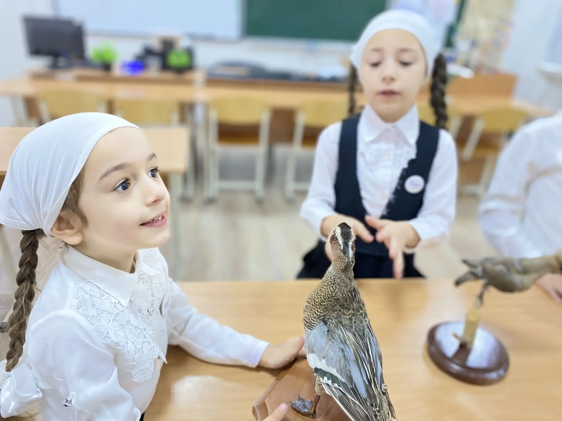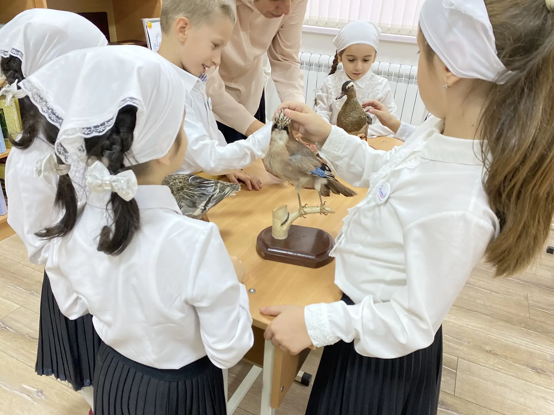 А ещё в гости к начинающим исследователям пришли «пернатые» экспонаты — учебные чучела птиц. Ребята с большим интересом и аккуратностью рассматривали оперение, клювы и лапки, узнавая о разнообразии птичьего мира нашей планеты. 🦉🐦⬛