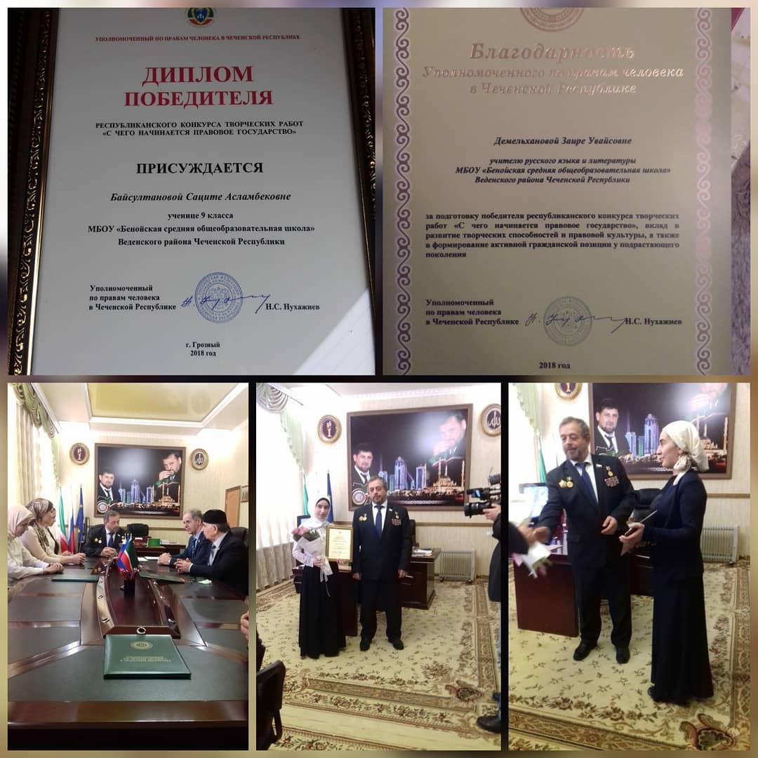 15.12.2018Поздравляем нашу ученицу 9 класса Байсултанову Сациту и ее руководителя Демельханову Заиру Увайсовну с победой на республиканском уровне. Сочинение , написанное Сацитой под руководством Заиры Увайсовны, стало победителем республиканского конкурса творческих работ "С чего начинается правовое государство". Конкурс был организован Институтом Уполномоченного по правам человека в Чеченской Республике. Родная школа гордится вашими успехами и радуется креативным, мотивированным, талантливым ученикам!