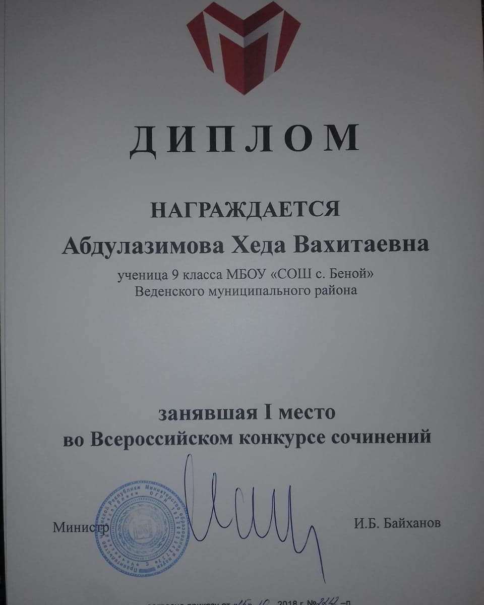 20.12.2018Поздравляем нашу замечательную ученицу 9 класса Абдулазимову Хеди с победой во Всероссийском конкурсе сочинений! Сочинение — вид письменной школьной работы — изложение своих мыслей, знаний на заданную тему.(С. И. Ожегов). Когда ребенок может не только грамотно изъясняться, но правильно изложить свои мысли на бумаге-это очень и вдохновляет и радует. Радуешься успехам ученика,благодаришь за работу учителя и понимаешь,что за этой победой стоит совместный кропотливый труд. Успехов вам, наши прекрасные ученики, и дальше!!