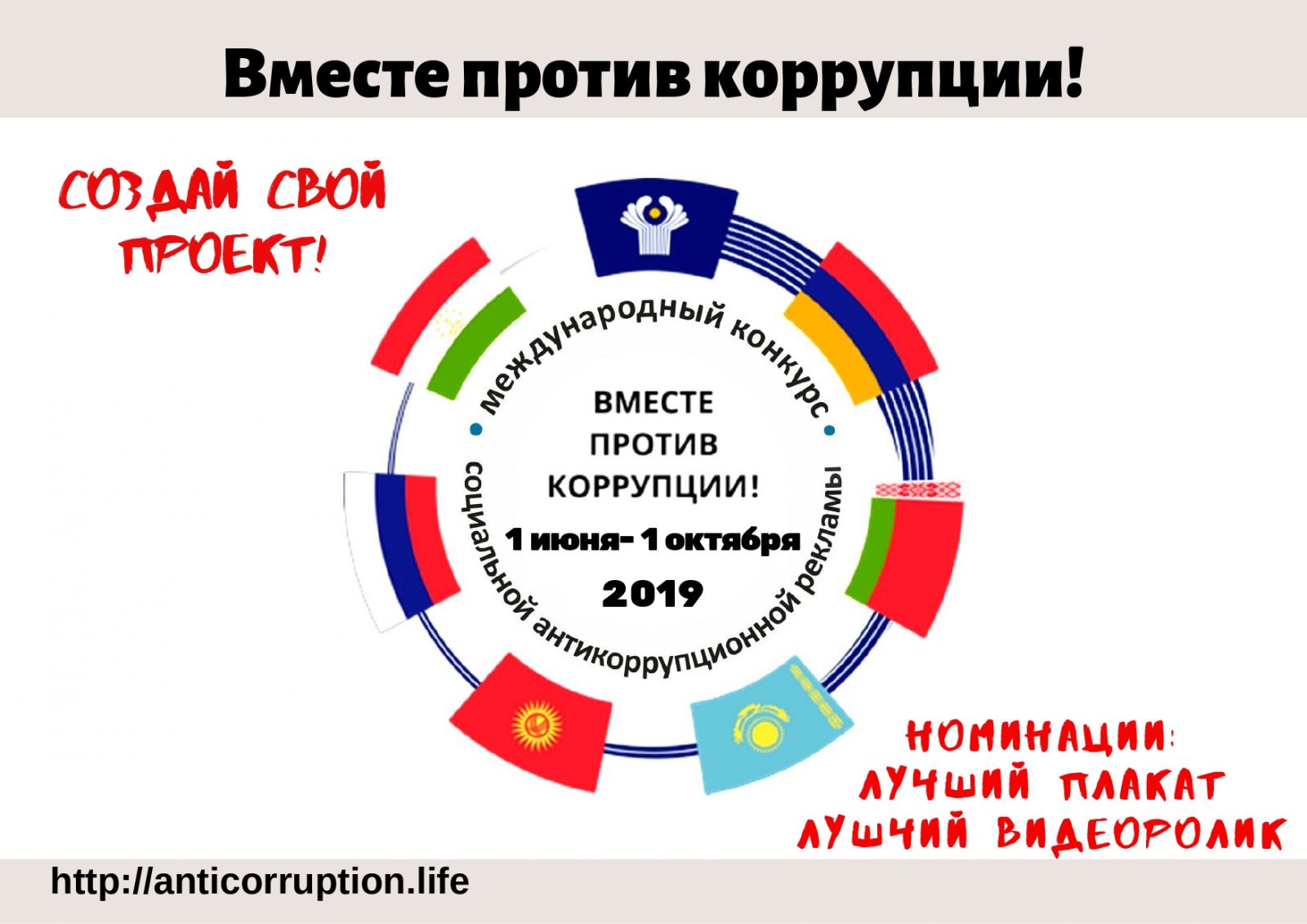 22.05.2019В 2019 году Генеральная прокуратура Российской Федерации выступает организатором Международного молодежного конкурса социальной антикоррупционной рекламы на тему «Вместе против коррупции!». К участию приглашаются молодые люди в возрасте от 14 до 35 лет , которым предлагается подготовить антикоррупционные плакаты и видеоролики на тему «Вместе против коррупции!». Торжественную церемонию награждения победителей конкурса планируется приурочить к Международному дню борьбы с коррупцией (9 декабря). Прием работ будет осуществляться с 1 июня по 1 октября 2019 г. на официальном сайте конкурса www.anticorruption.life
